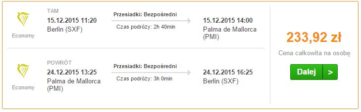 Wylatując z Berlina na Majorkę w dniu 15.12 i wracając 24.12 za bilet lotniczy do stolicy wyspy zapłacimy tylko 233 zł za osobę.